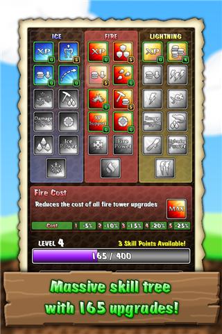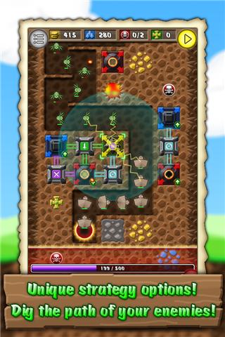 而在继续往下挖的过程中,玩家挖到的有可能是宝藏,也有可能是邪恶的敌人。当挖到敌人时,就像是挖到了会向上喷发的水,他们会不停地向上涌进。这时玩家要立刻采取行动,否则整个城堡就会被他们占领。玩家首 先要在画面中选好要建立塔防的位置,待出现绿色荧光圈时,就可以选择下方不同威力的塔了(每关提供了6种不同威力的塔,随着游戏的进行也可以将这些塔升级或是卖掉)。