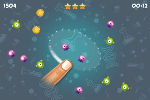 游戏的操作非常简单,虽然游戏也有iPhone版本,但是真心觉得还是在iPad上玩起来爽快。屏幕中各种各样的细菌会不断的游来游去,速度很快,你需要看准了时机,画一个圆圈,将其中的几个相同类型的细菌包进去,这样它们就能够生成一个更大的细菌了。如果包进去不同的细菌,则无法生成大细菌,如果是包进去病毒,那就完蛋了。