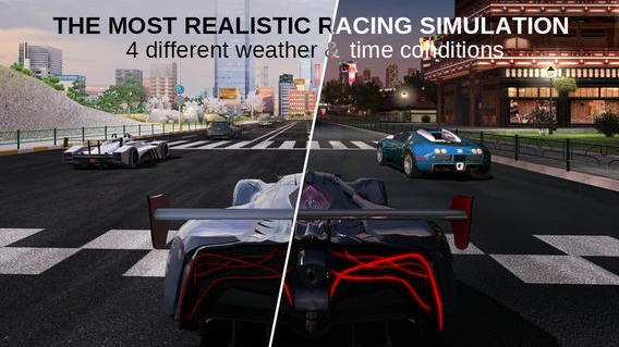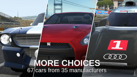 《GT赛车 2》以"真车"为卖点,收录总共 67 辆来自世界各地的知名汽车,赛道方面也引用了世界各大竞速赛的真实跑道。在比赛的过程中,汽车的加速、惯性、碰撞等方面的物理表现也将更加严谨,整体给人的感觉会比《Asphalt 8》写实的多。当然写实风格除了体现在画面之外,操作体验也同样能够给人带来身临其境的感觉。