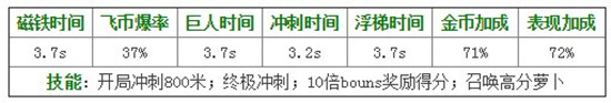 技能:开局冲刺800米;终极冲刺;10倍bouns奖励得分;吃到道具金币变高分萝卜